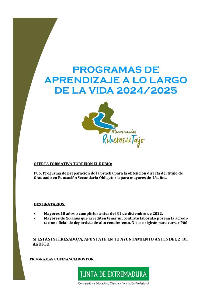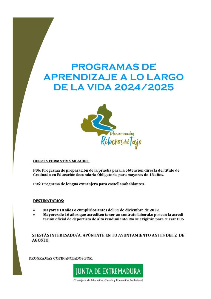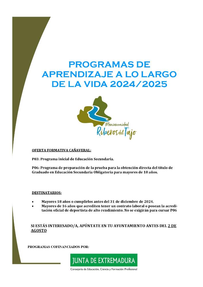 Por resolución de 3 de julio de 2024, de la Dirección General de Formación Profesional, Innovación e Inclusión Educativa, por la que se resuelve la concesión de ayudas para la realización de Programas de Aprendizaje a lo Largo de la Vida en la Comunidad Autónoma de Extremadura, durante el curso 2024/2025, la Mancomunidad Riberos del Tajo ha sido beneficiaria de ayudas para poner en marcha seis programas en los municipios de Cañaveral, Casas de Millán, Mirabel y Torrejón el Rubio.