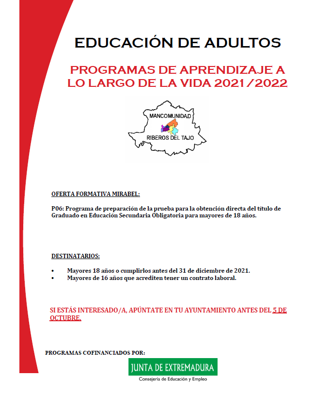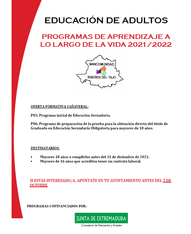 Por resolución de 10 de septiembre de 2021, de la Dirección General de Formación Profesional y Formación para el Empleo, por la que se resuelve la concesión de ayudas para la realización de Programas de Aprendizaje a lo Largo de la Vida en la Comunidad Autónoma de Extremadura, durante el curso 2021/2022, la Mancomunidad Riberos del Tajo ha sido beneficiaria de ayudas para poner en marcha dos programas en el municipio de Cañaveral y un programa en el municipio de Mirabel.